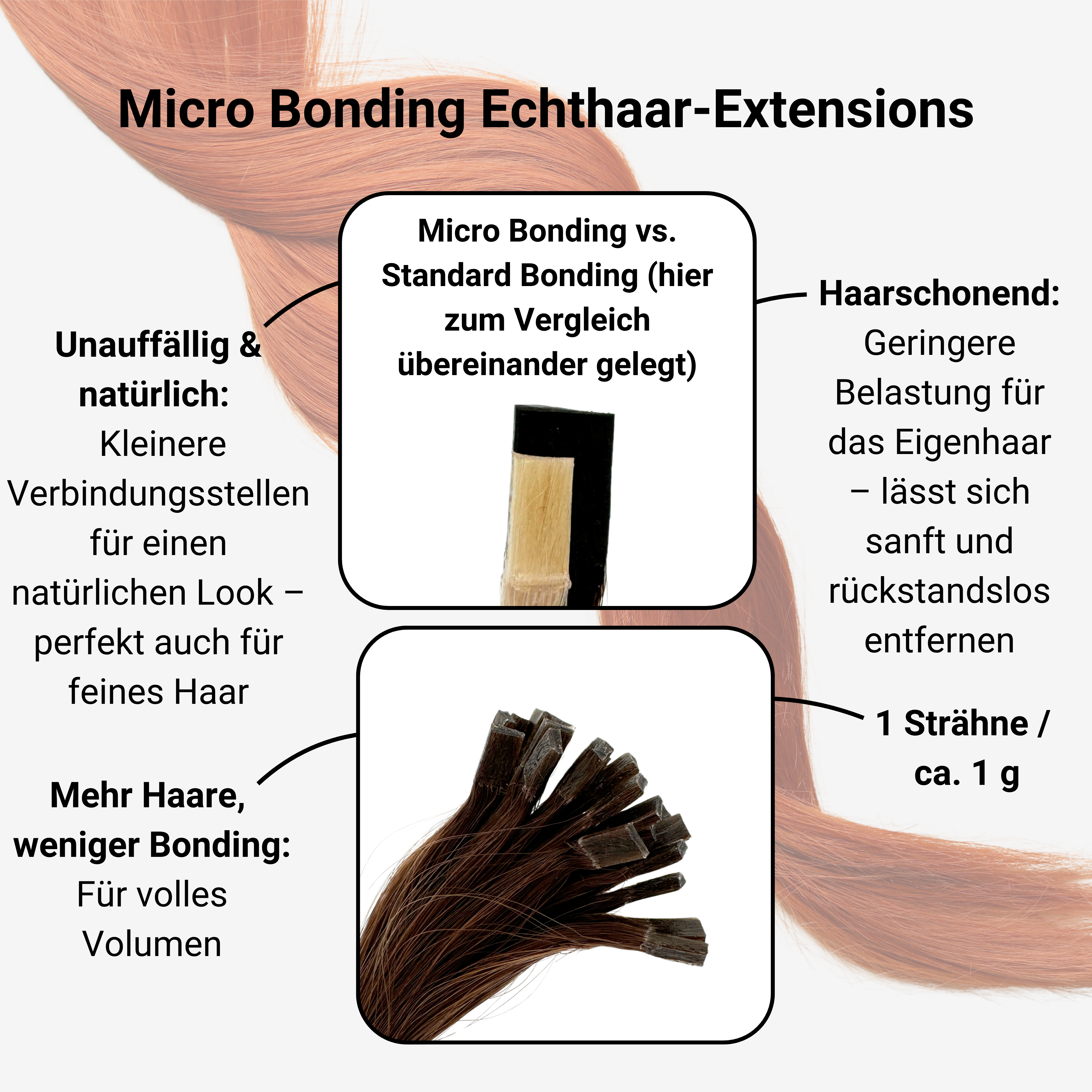 Micro Bonding Echthaar-Extensions bieten eine natürliche und lang anhaltende Haarverlängerung oder -verdichtung. Sie werden sicher am eigenen Haar befestigt und ermöglichen vielseitiges Styling. Mit hochwertigem Echthaar und unauffälligen Micro-Bondings passend zu der jeweiligen Farbe bieten sie ein authentisches Aussehen und sind pflegeleicht.